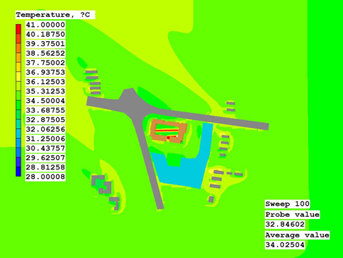 夏季熱環(huán)境模擬區(qū)域內(nèi)初始溫度設(shè)為32.8℃。在夏季高溫時(shí),項(xiàng)目?jī)?nèi)部人行區(qū)域風(fēng)場(chǎng)較為流暢,沒(méi)有明顯的高溫區(qū)域,場(chǎng)地平均溫度34.0℃,熱島強(qiáng)度1.2℃。項(xiàng)目建筑表面溫度基本維持在36.2℃到39.3℃之間,建筑表面溫度不高,無(wú)熱量堆積,不對(duì)周邊環(huán)境產(chǎn)生不良影響,項(xiàng)目建筑夏季熱環(huán)境較為理想。