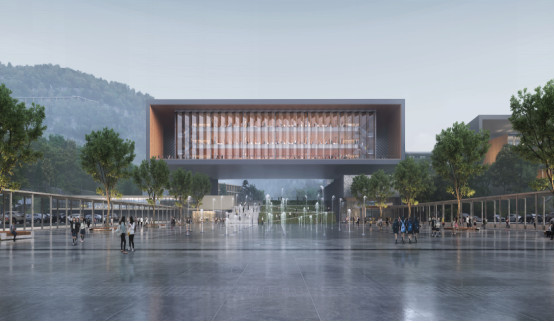 作為最重要的校園標(biāo)志性建筑,圖書館把校園的“雅正文化”發(fā)揮到極致。崇德廣場,莊重的儀式感,作為全校集會的場所,體現(xiàn)的是“正”而在鏡湖一側(cè),圖書館則融合景觀具有詩情畫意,是“雅”圖書館通過首層架空的體量串聯(lián)起室外廣場和鏡湖的人流,主題閱覽位于崇德廣場正中的體量,通過通高的中庭空間提供內(nèi)部閱讀充足的觀景視野。圖書館東翼結(jié)合山地特色,是自習(xí)室和輔助辦公等功能區(qū)域。行政樓位于圖書館西側(cè),順應(yīng)地勢起伏創(chuàng)造了層層跌落的建筑造型,建筑造型簡潔通透,突出了圖書館主角的同時創(chuàng)造了多樣的灰空間,與周邊景觀和山地完美融合。1#圖書館地上建筑面積25108.4㎡,采用雙混凝土核心筒+雙層鋼桁架結(jié)構(gòu)體系,剪力墻抗震等級為一級,鋼框架抗震等級為二級;其余建筑采用框架結(jié)構(gòu)。