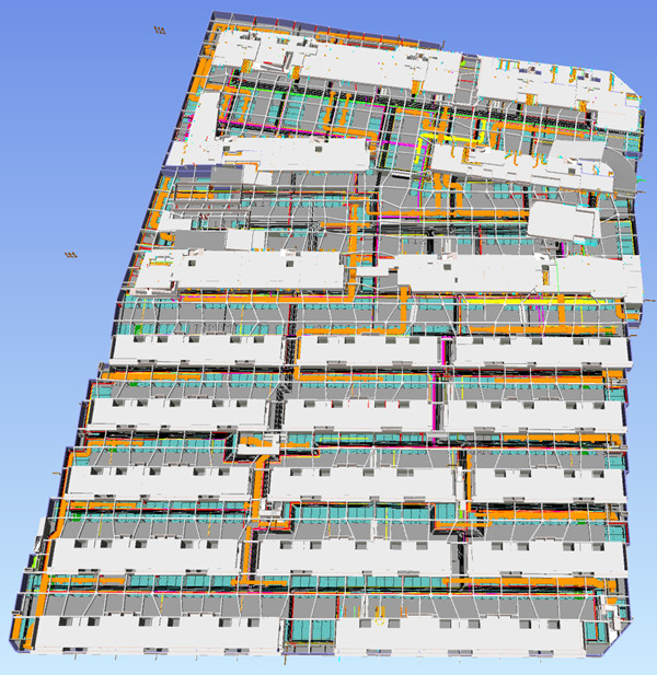 主樓部分管線都集中通道上,在滿足國家規(guī)范及業(yè)主對凈高要求的原則下,管線盡量排布在一起,但因通道寬度不能滿足管線平排的情況下,做多層布置,此種情況下施工時需要注意安裝先后順序。